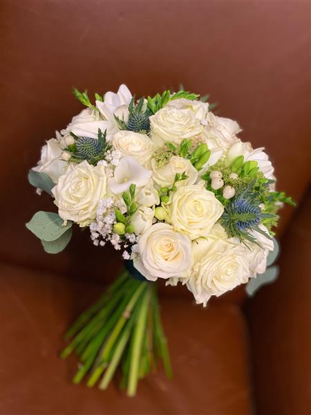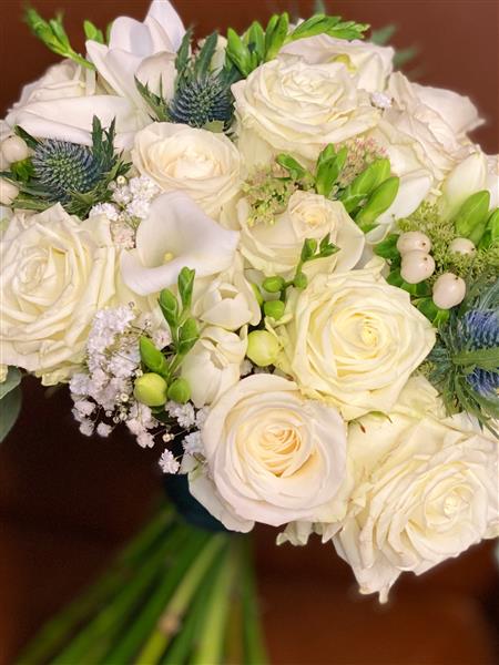 A classic brides hand-tied posy of white roses, freesia, gypsophila with a Dutch of blue thistle.