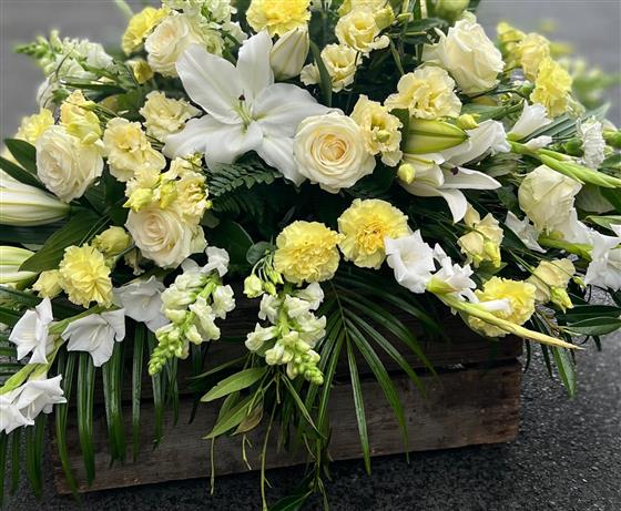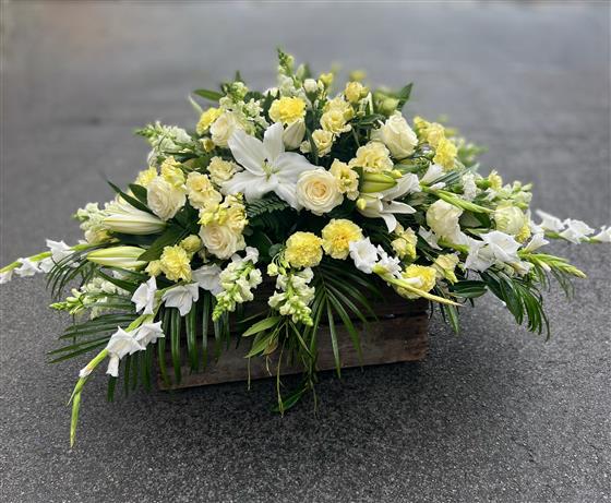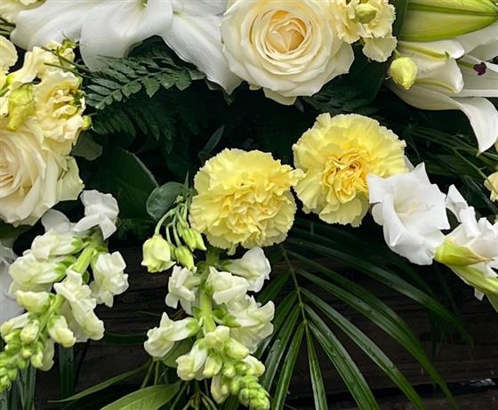 A classic cream and green casket spray which include Lilies, Roses and Eustoma Lisianthus which is specifically created to go on top of a coffin. It is complemented by fine white flowers and seasonal green foliage. The whole tribute remains in a cream and green tone.