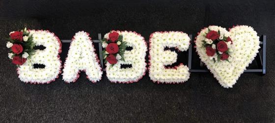 A 12" heart is placed next to the BABE letters and floral sprays will be placed to look balanced on the tribute.