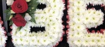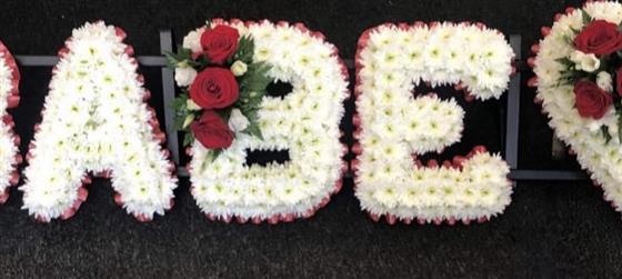 BABE Letters based in double white Chrysanthemum with your choice of colour ribbon and spray.