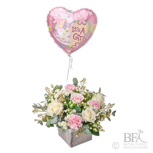 A pretty pink arrangement designed to welcome a new arrival to the world. Delicate shades of pink and white flowers surround beautiful Roses and Carnations. As a finishing touch this design comes with a baby balloon.