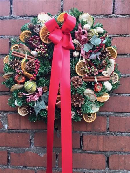 We will provide an array of foliage, cones, dried fruits, cinnamon and ribbons to make your one-of-a-kind festive Wreath.