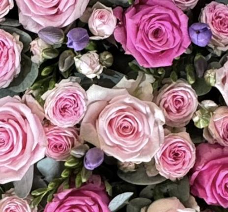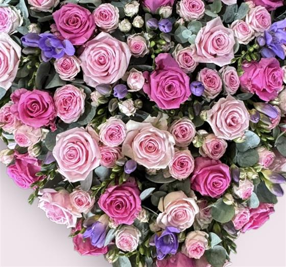 A truly gorgeous heart filled with roses, freesias and sweet smelling foliage