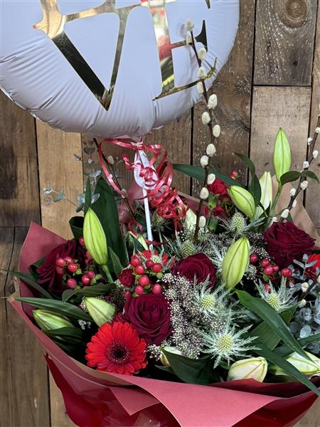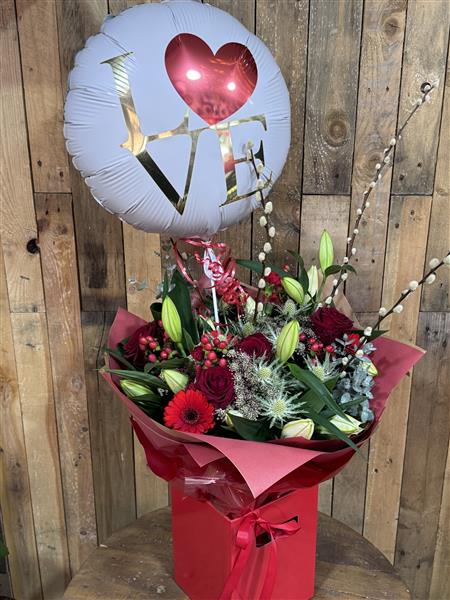 A beautiful array of reds and white romantic flowers with a love balloon.