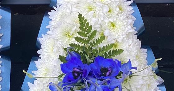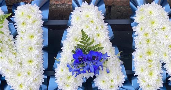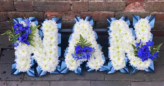 This NAN funeral flowers tribute is based in white Double Chrysanthemums. Choose your colour ribbon and the floral sprays (one on each letter to match your ribbon choice). A perfect and fitting floral tribute for a much loved Nan.