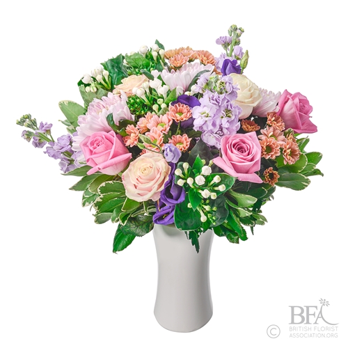 A Handtied of pleasurable pastel flowers that will give fragrance and a feminine touch to any home. It will be delivered gift wrapped but displayed in a vase. The vase can be purchased to enhance the gift.