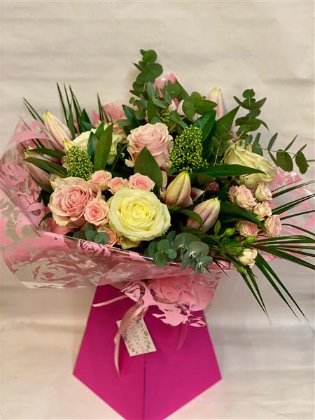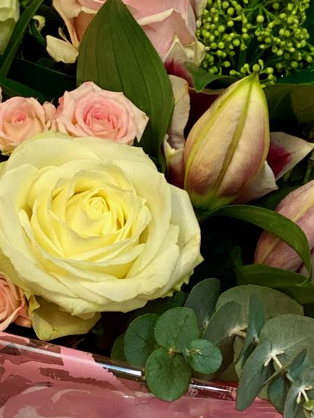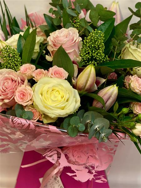 A Pretty mixed of pastel roses and lilies.