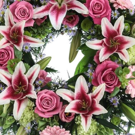 Subtle colours incorporating lilies and roses to create this elegant wreath.