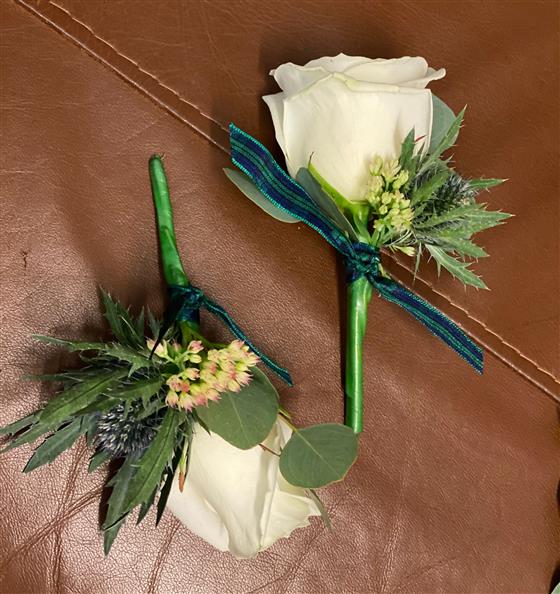White Roses with thistle and Heather accents.