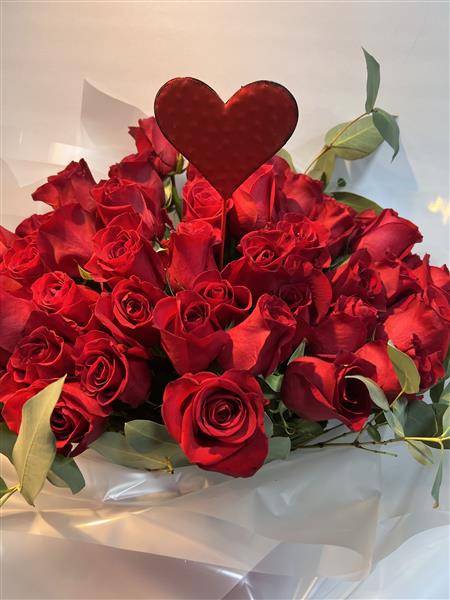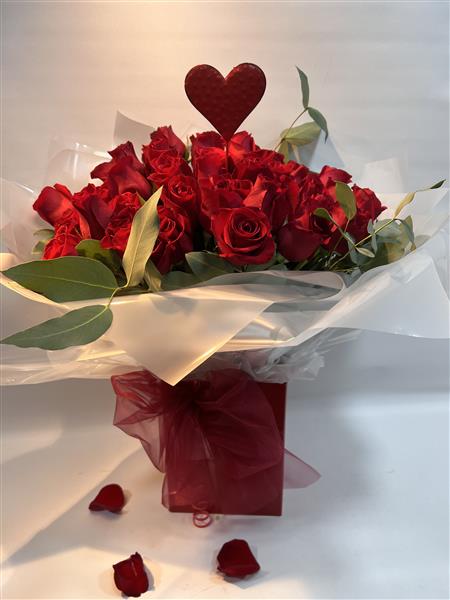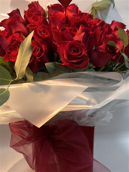 A beautifully romantic bouquet of Two dozen luxury 'Red Naomi' red Roses. Impeccably presented and ready to display. These velvety, best quality red Roses will be presented as a hand tied bouquet with interesting foliages.