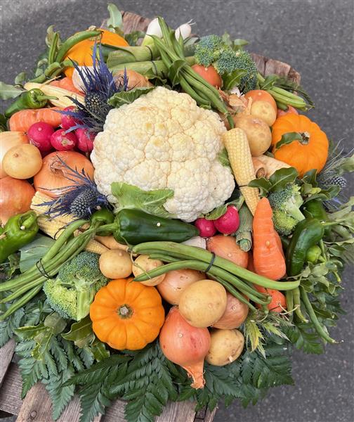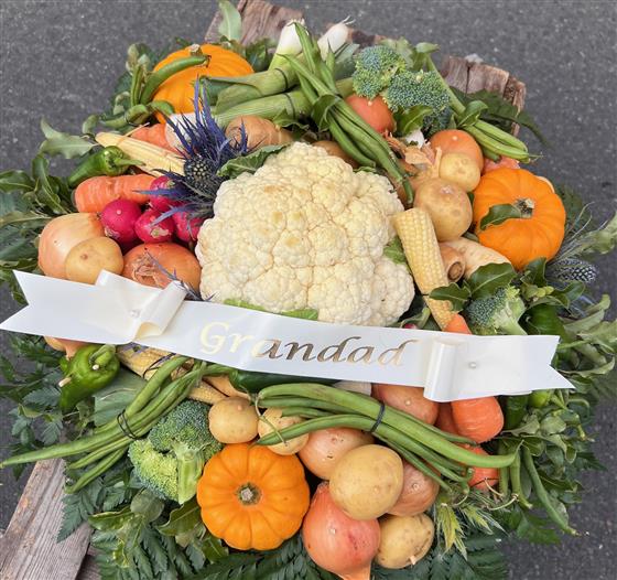 A medley of vegetables perfect for a keen gardener, someone who was always at the allotment, a chef or just because you want to send something completely different. The wreath will be hand made from a selection of seasonally available vegetables and foliages which may include herbs.