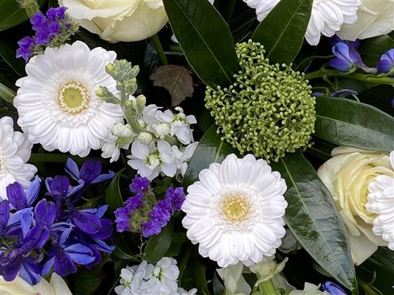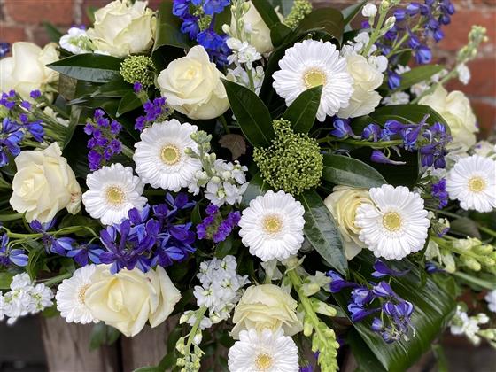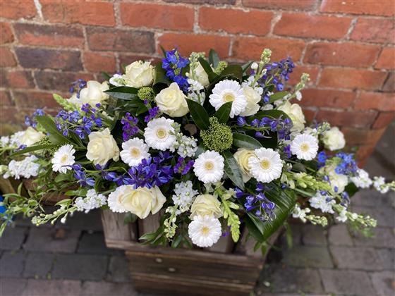 Roses are a symbols of love, friendship, peace and so much more. This wonderful White Rose, Gerbera & Blue Casket Spray is filled with the finest flowers.