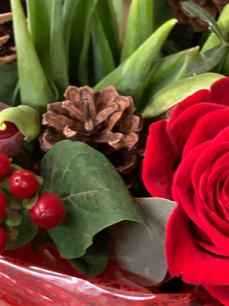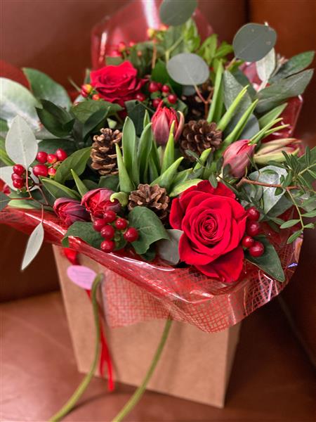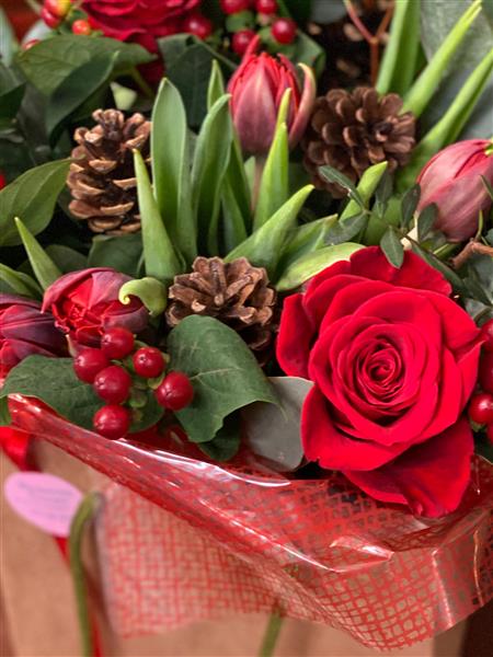 A Classic, Christmas hand-tie of Red Roses,Tulips and Pine Cones making this Winter Chic.