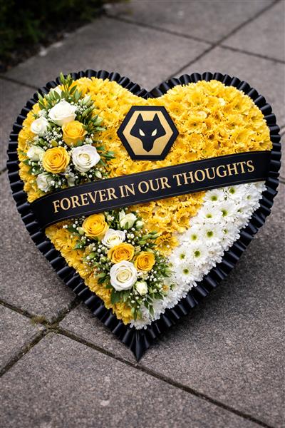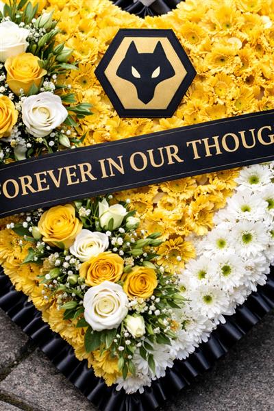 Perfect for every Wolves Football Fan. The traditional tribute is created using a white and yellow chrysanthemum base and a spray of flowers as pictured or in your choice of colours. Choose between a foliage or ribbon surround