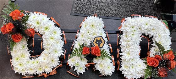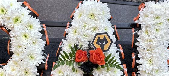 Perfect for every Wolves Football Fan. The traditional tribute is created using a white chrysanthemum base and a spray of flowers as pictured or in your choice of colours. Choose between a foliage or ribbon surround