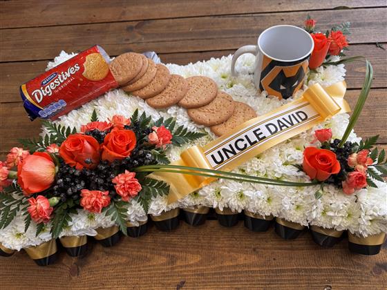 Perfect for every Wolves Football Fan. The traditional tribute is created using a white chrysanthemum base and a spray of flowers as pictured or in your choice of colours. Choose between a foliage or ribbon surround