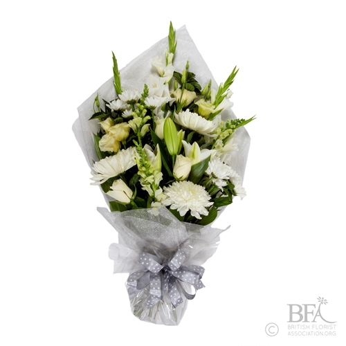 A combination of white flowers, gift wrapped to present to someone who loves to arrange flowers.