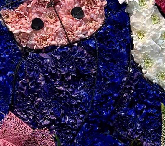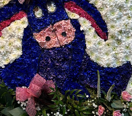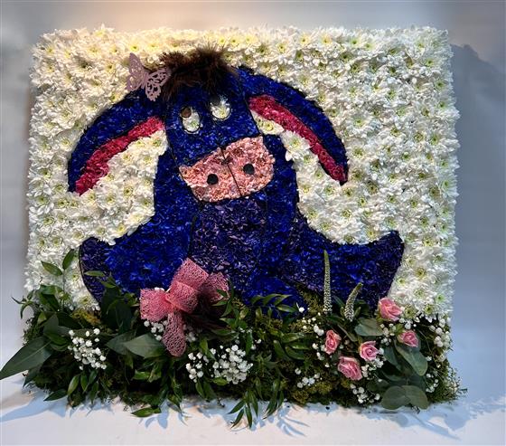 Disney cartoon character funeral tribute of Eeyore the donkey from the Winnie the Pooh cartoon series. Eeyore is reproduced in flowers and the details are completed with bows and butterflies. Eeyore is sitting on e bed of textured foliage and grasses. A superb personalised floral tribute for a special loved one.