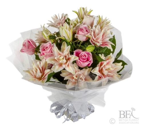 Handtied Bouquet of stunning pink Roses and beautiful Lilies. Complemented with luxury gift wrapping.