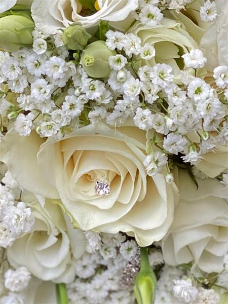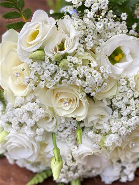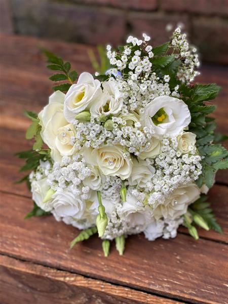 Hand-tied wedding bouquet of white roses, Lizzianthus and gypsophila with a foliage surround finished with a stain ribbon